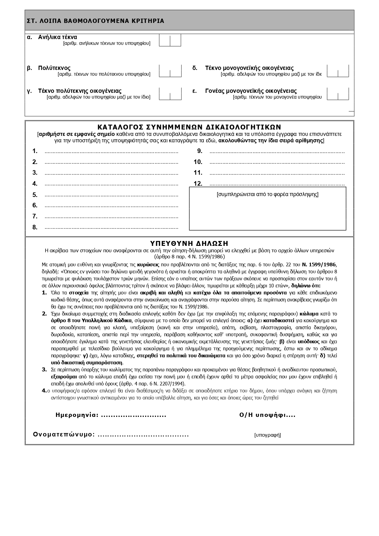 Τέκνο πολύτεκνης οικογένειας : Ο υποψήφιος πολύτεκνης οικογένειας βαθμολογείται με 5 μονάδες για κάθε ένα (1) τέκνο.