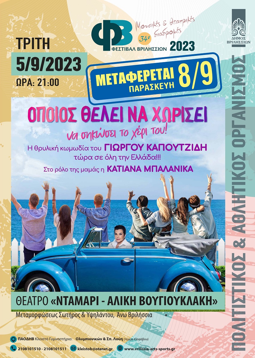 Η σημερινή προγραμματισμένη παράσταση ”ΟΠΟΙΟΣ ΘΕΛΕΙ ΝΑ ΧΩΡΙΣΕΙ ΝΑ ΣΗΚΩΣΕΙ ΤΟ ΧΕΡΙ ΤΟΥ” ΤΟΥ ΓΙΩΡΓΟΥ ΚΑΠΟΥΤΖΙΔΗ εξαιτίας των αναμενόμενων δυσμενών καιρικών φαινομένων, αναβάλλεται για την ερχόμενη Παρασκευή 8 Σεπτεμβρίου 2023.