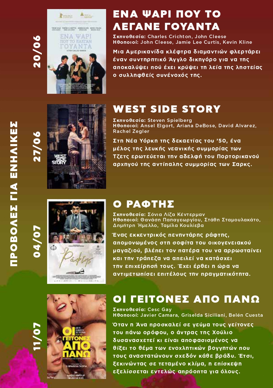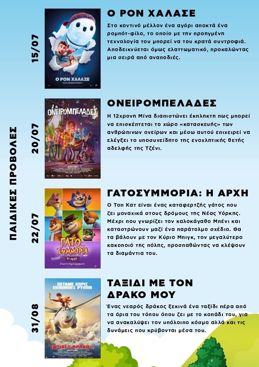 Οι ταινίες που θα προβληθούν θα είναι μια επιλογή από παιδικές, οικογενειακές, κωμωδίες, καλλιτεχνικές και σινεφίλ, που θα γεμίσουν τα βράδια μικρών και μεγάλων, ταξιδεύοντάς μας με τον πιο ψυχαγωγικό τρόπο και προσφέροντας στο κοινό που αγαπά το σινεμά, εναλλακτικές διεξόδους διασκέδασης.