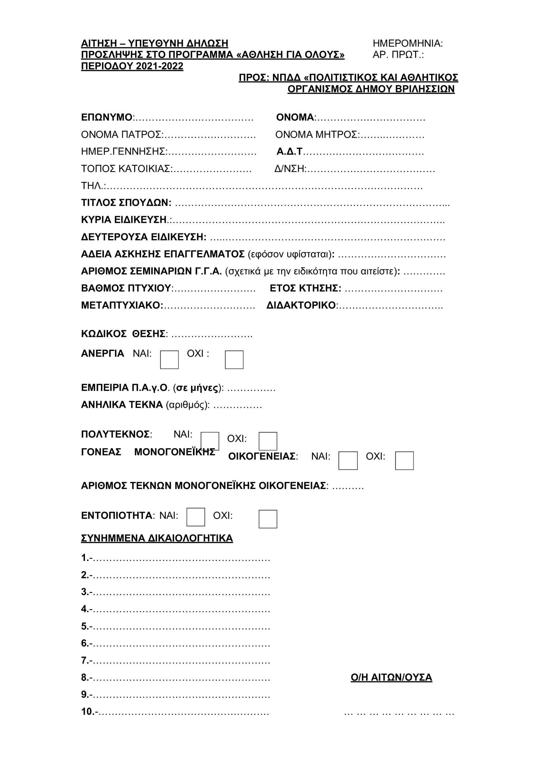 Αθλητικός Οργανισμός Δήμου Βριλησσίων προτίθεται να προσλάβει δύο (2) ΠΦΑ εκ των δέκα (10) ΠΦΑ σύμφωνα με την ανωτέρω προϋπόθεση.