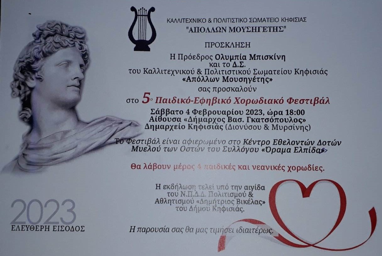 Το Καλλιτεχνικό & Πολιτιστικό Σωματείο Κηφισιάς ¨ΑΠΟΛΛΩΝ ΜΟΥΣΗΓΕΤΗΣ¨, θα διοργανώσει παιδικό-εφηβικό χορωδιακό φεστιβάλ αφιερωμένο στο κέντρο εθελοντών δοτών μυελού των οστών του Συλλόγου ¨ΟΡΑΜΑ ΕΛΠΙΔΑ¨.