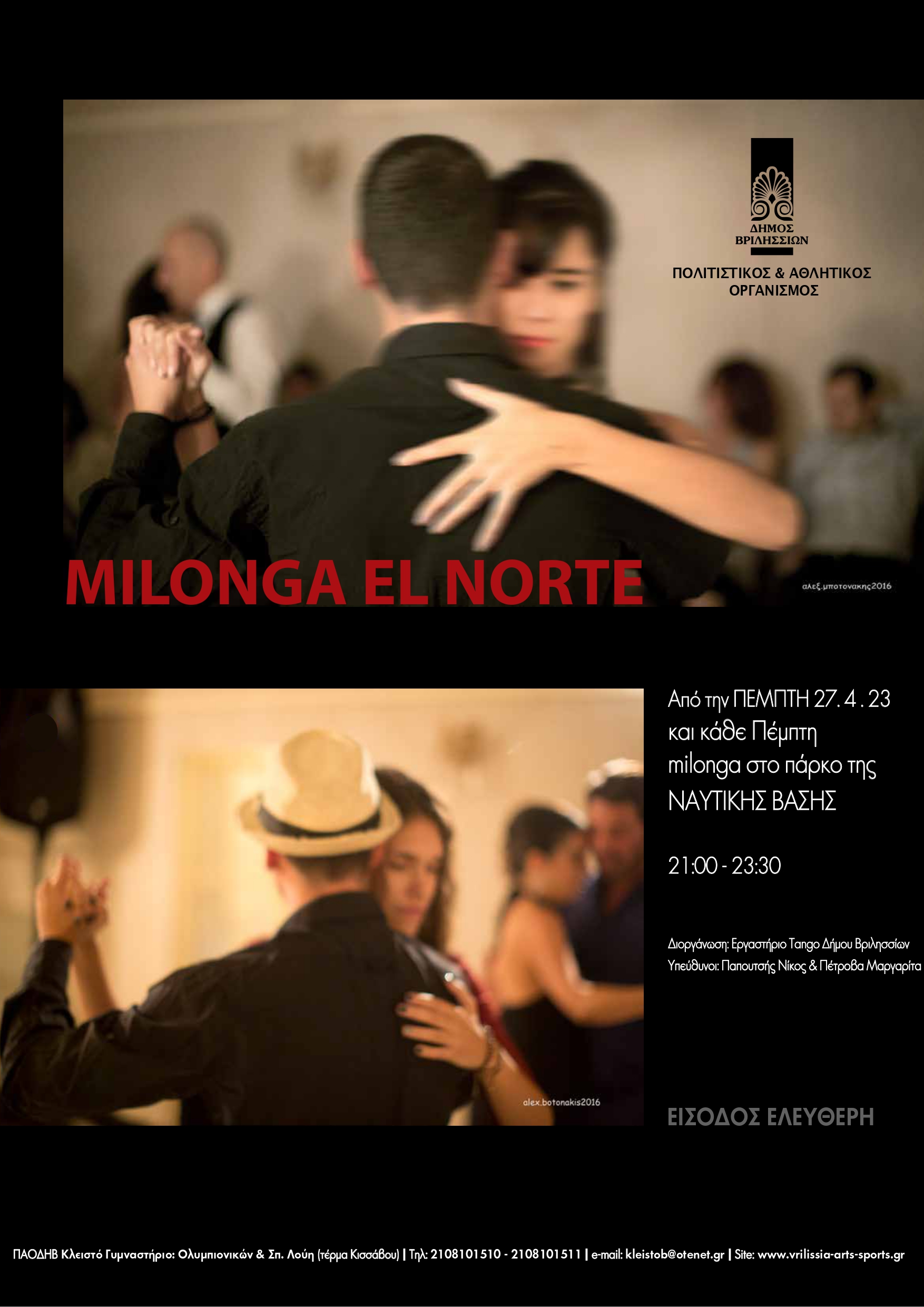 Το εργαστήριο Αργεντίνικου Tango του Πολιτιστικού & Αθλητικού Οργανισμού του Δήμου Βριλησσίων, από αύριο Πέμπτη 27 Απριλίου 2023 και κάθε Πέμπτη από ώρα 21:00 έως 23:00 θα διοργανώνει βραδιές ΜΙLONGA στο Πάρκο ΜΑΡΙΑ ΚΑΛΛΑΣ (πρώην Ναυτική Βάση) Λ. Πεντέλης & Αναπαύσεως, στα Βριλήσσια.