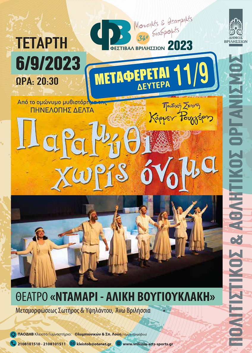 ΑΝΑΒΟΛΗ ΘΕΑΤΡΙΚΗΣ ΠΑΡΑΣΤΑΣΗΣ ΛΟΓΩ ΑΣΧΗΜΩΝ ΚΑΙΡΙΚΩΝ ΣΥΝΘΗΚΩΝ Η σημερινή προγραμματισμένη παιδική θεατρική παράσταση ”ΠΑΡΑΜΥΘΙ ΧΩΡΙΣ ΟΝΟΜΑ” της Πηνελόπης Δέλτα, εξαιτίας των αναμενόμενων δυσμενών καιρικών φαινομένων, αναβάλλεται και μεταφέρεται την ερχόμενη…
