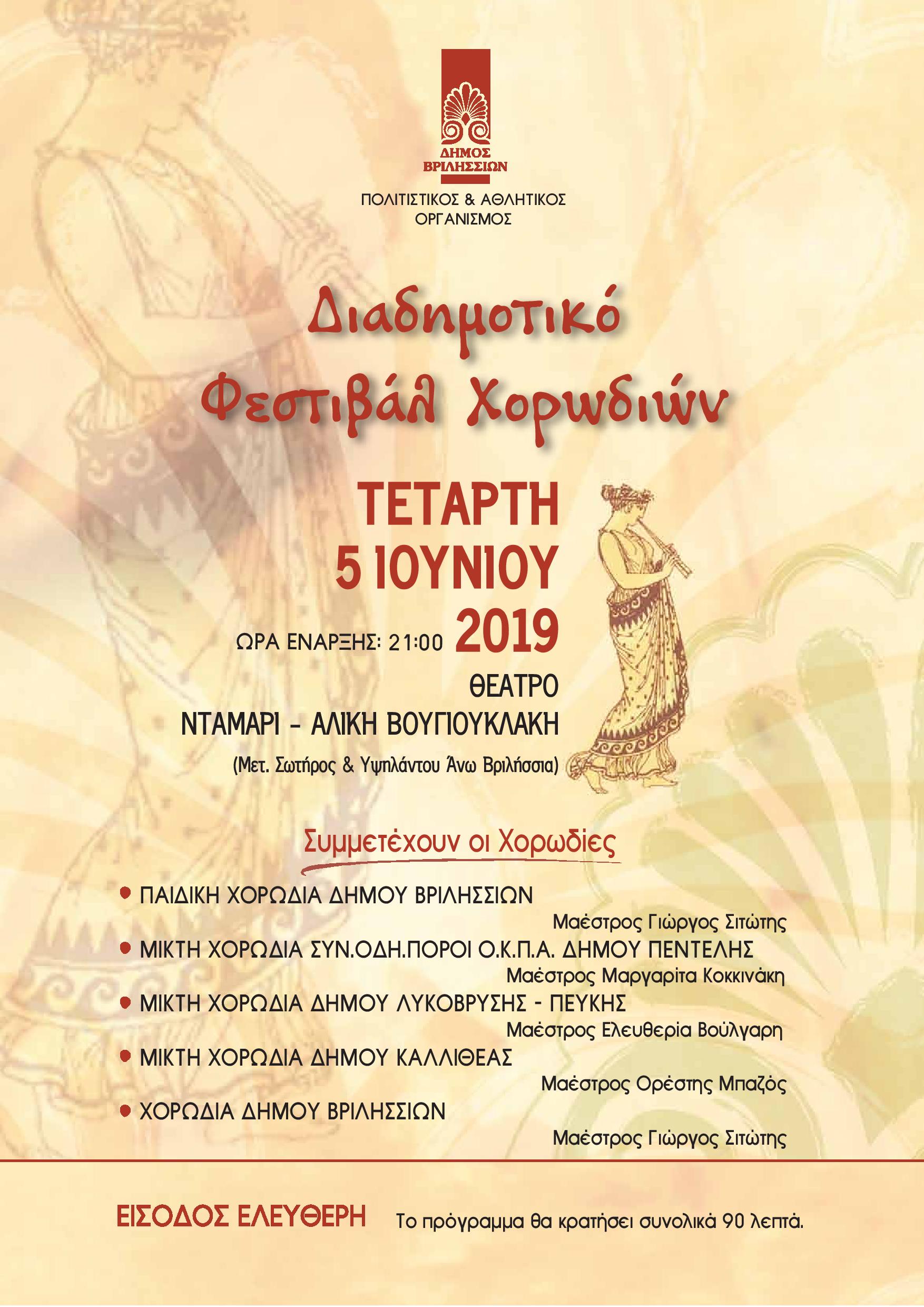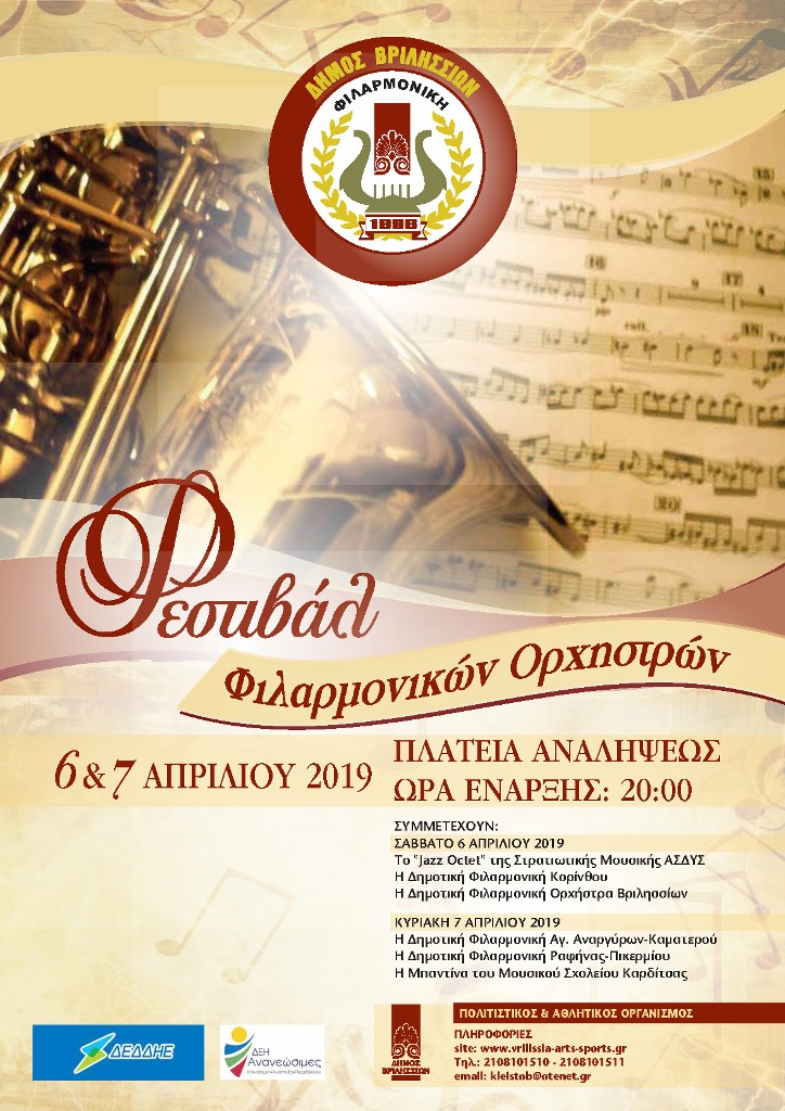 Ο Πολιτιστικός & Αθλητικός Οργανισμός, θα διοργανώσει «Φεστιβάλ Φιλαρμονικών Ορχηστρών», το Σάββατο 6 & την Κυριακή 7 Απριλίου 2019 στην Πλατεία Ανάληψης στα Βριλήσσια.