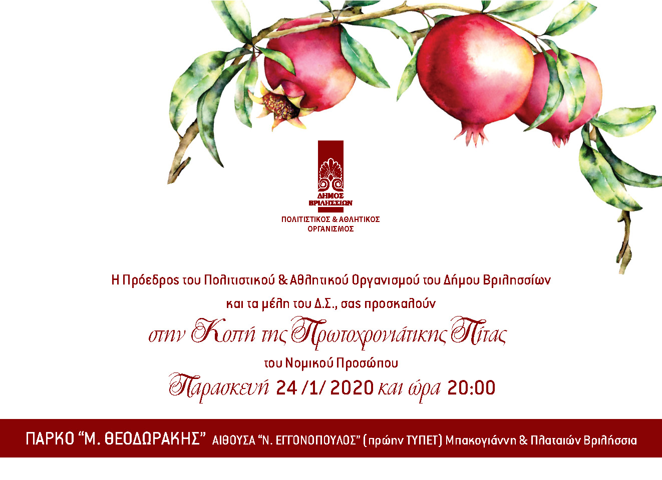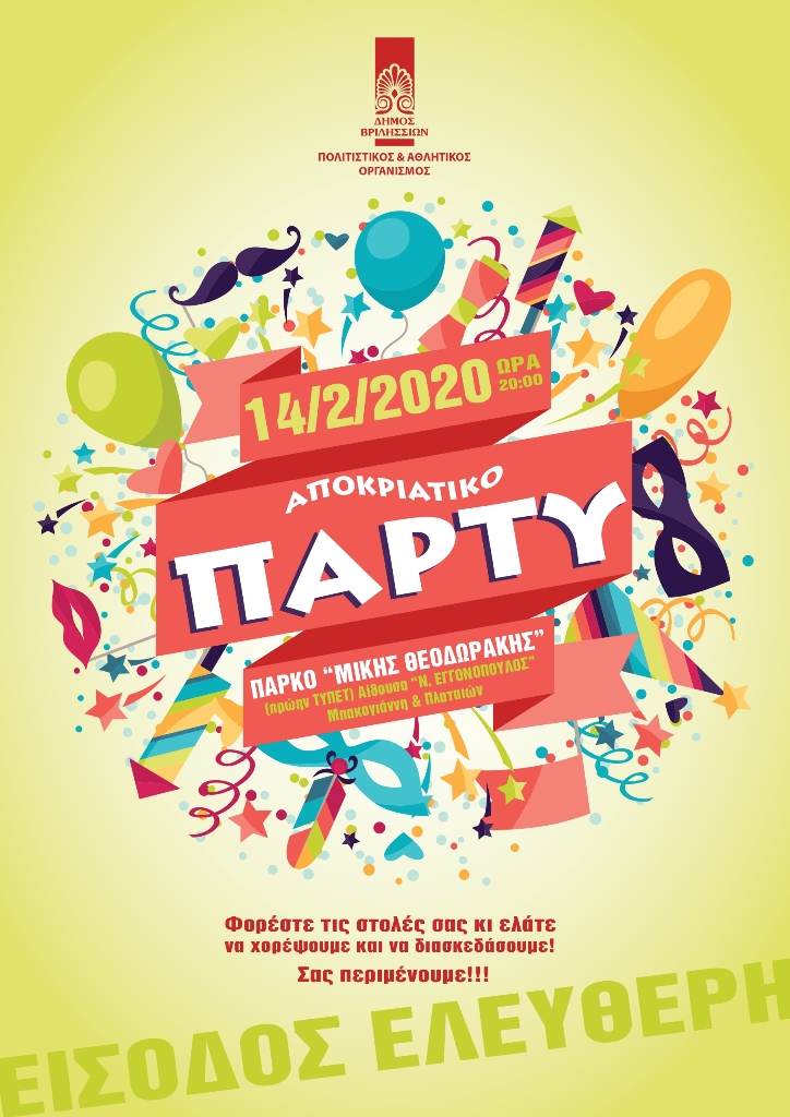 Ο Πολιτιστικός και Αθλητικός Οργανισμός του Δήμου Βριλησσίων θα διοργανώσει αποκριάτικο πάρτυ για τους εργαζόμενους, τα μέλη και τους φίλους του, την Παρασκευή 14 Φεβρουαρίου 2020 και ώρα 20:00 στην…