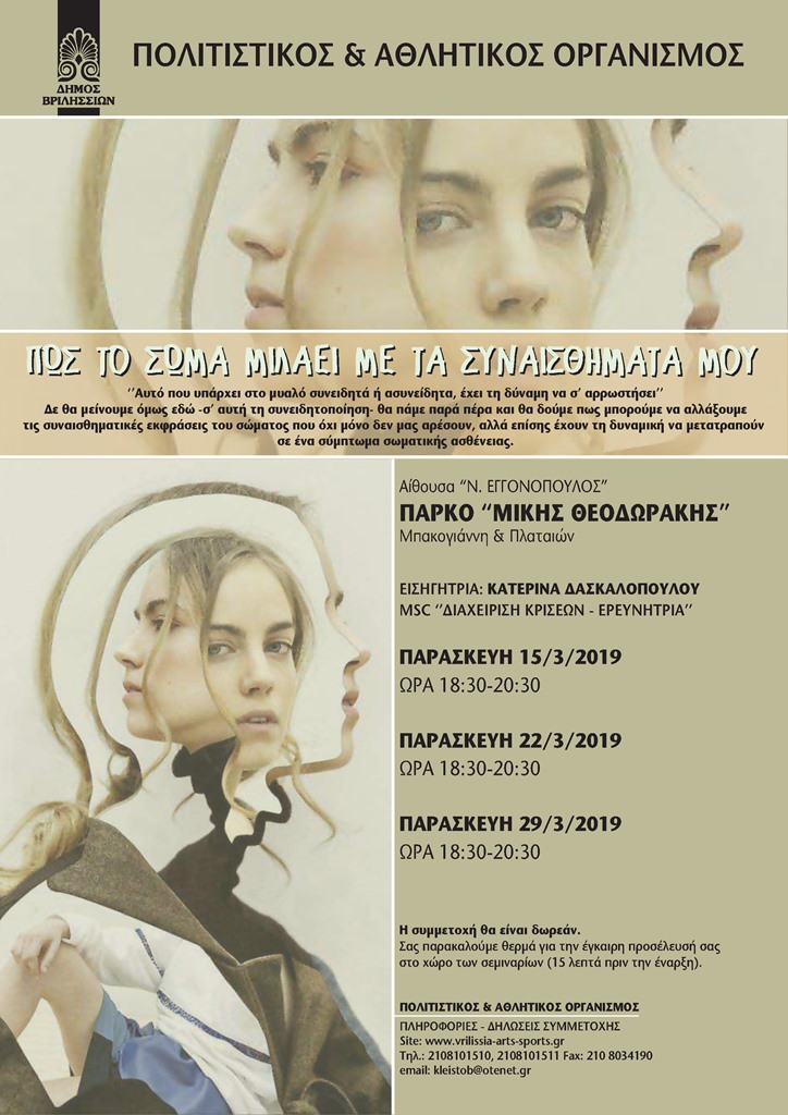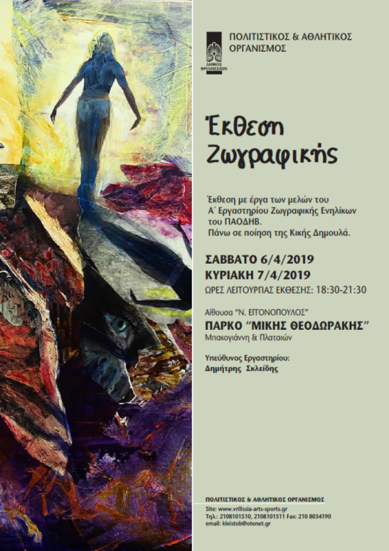 Η Πρόεδρος του Πολιτιστικού & Αθλητικού Οργανισμού του Δήμου Βριλησσίων και ο υπεύθυνος του Α΄ Εργαστηρίου Ζωγραφικής Ενηλίκων Δημήτρης Σκλείδης, σας προσκαλούν στην έκθεση με έργα των μαθητώντου Εργαστηρίου, πάνω…