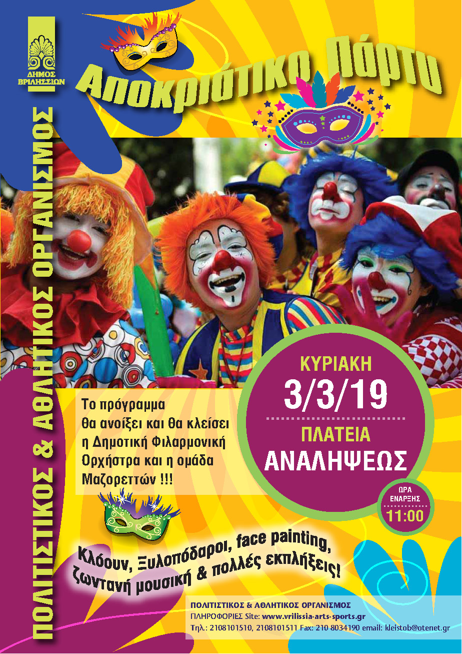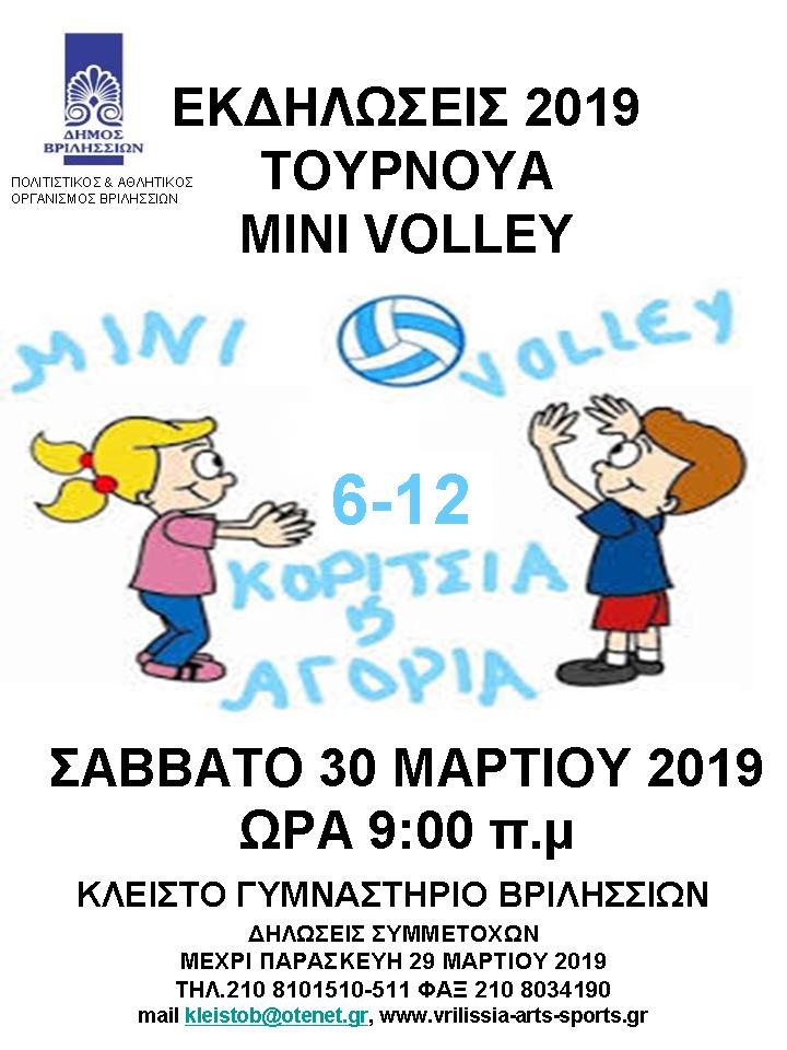 Ο Πολιτιστικός & Αθλητικός Οργανισμός του Δήμου Βριλησσίων θα διοργανώσει Τουρνουά Μίνι Volley στο Κλειστό Γυμναστήριο Βριλησσίων (Ολυμπιονικών & Σπύρου Λούη), το Σάββατο 30 Μαρτίου 2019 και ώρα 09:00.