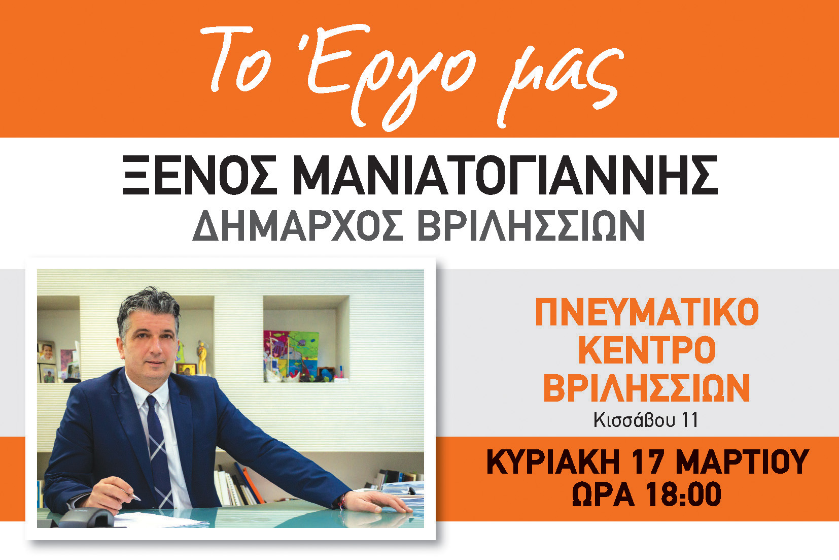 Ο Δήμαρχος Βριλησσίων Ξένος Μανιατογιάννης, θα παρουσιάσει το έργο της διοίκησής του στο Δήμο, την Κυριακή 17 Μαρτίου 2019 και ώρα 18.00, στην αίθουσα Μουσών του Πνευματικού Κέντρου του Δήμου…
