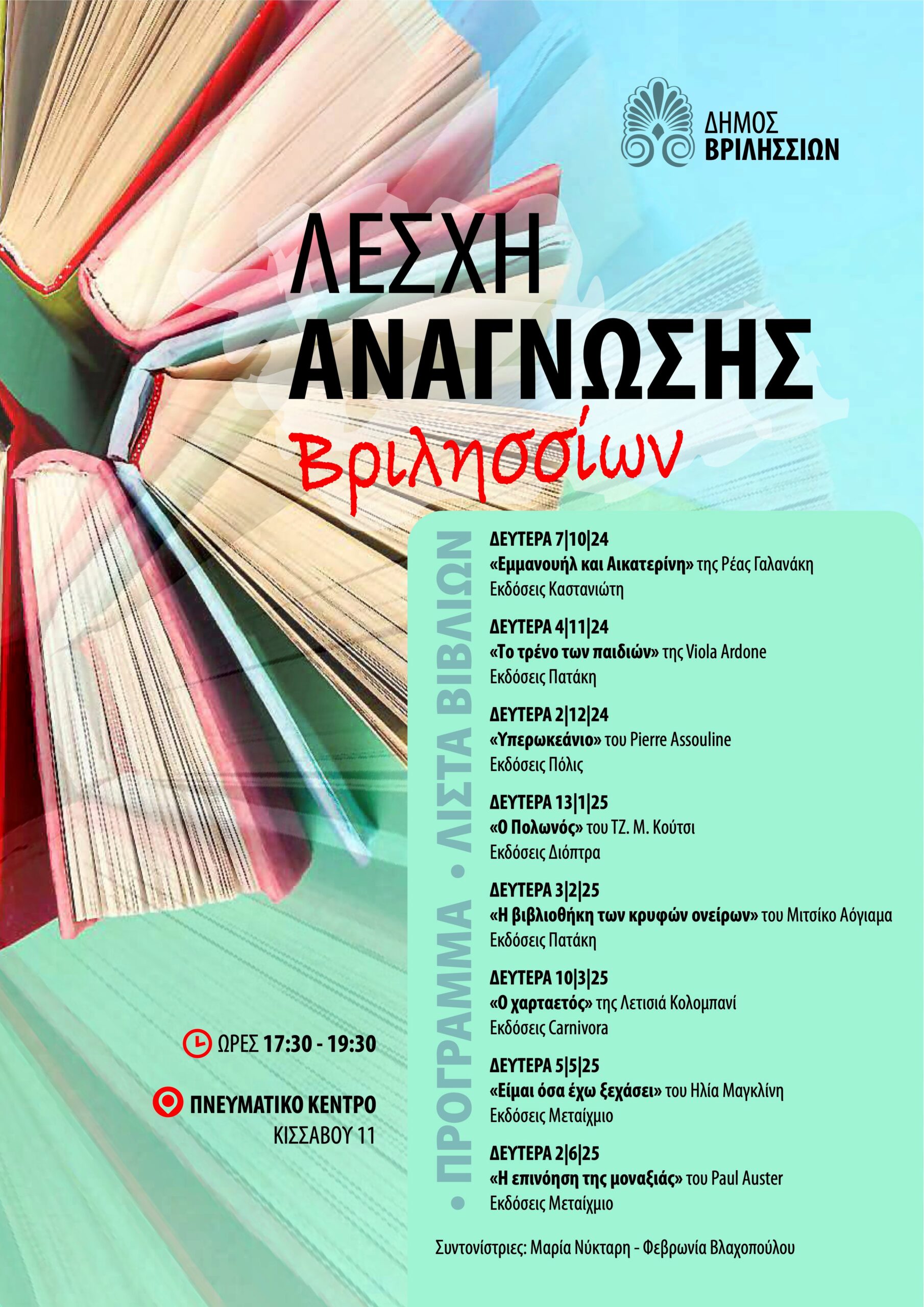 ENAΡΞΗ ΛΕΣΧΗΣ ΑΝΑΓΝΩΣΗΣΞεκινά τη Δευτέρα 2 Οκτωβρίου 2023 η Λέσχη Ανάγνωσης Βριλησσίων.Οι συναντήσεις θα γίνονται κάθε πρώτη Δευτέρα του μήνα στην αίθουσα ΜΟΥΣΩΝ του Πνευματικού Κέντρου του Δ. Βριλησσίων (Κισσάβου 11, 1ος…