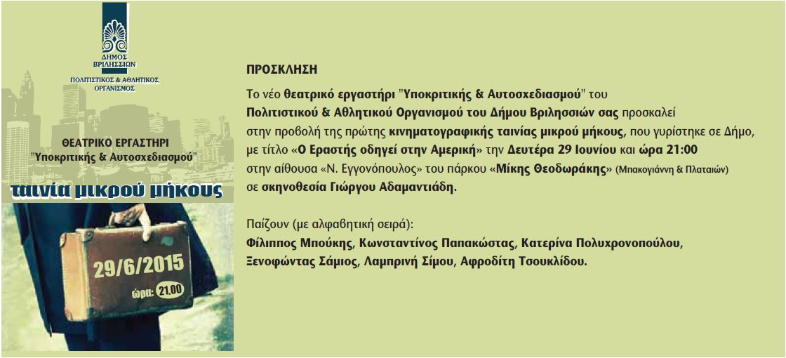 ΔΕΛΤΙΟ ΤΥΠΟΥ ΓΙΑ ΤΟ ΘΕΑΤΡΙΚΟ “ΤΑ ΚΙΤΡΙΝΑ ΓΑΝΤΙΑ” 24/06/2015 Με μεγάλη επιτυχία πραγματοποιήθηκε την Παρασκευή 19 Ιουνίου, το Σάββατο 20, την Κυριακή 21 και τη Δευτέρα 22 Ιουνίου 2015, η θεατρική παράσταση που ανέβασε το Β΄ Θεατρικό Εργαστήρι Ενηλίκων… Διαβάστε Περισσότερα