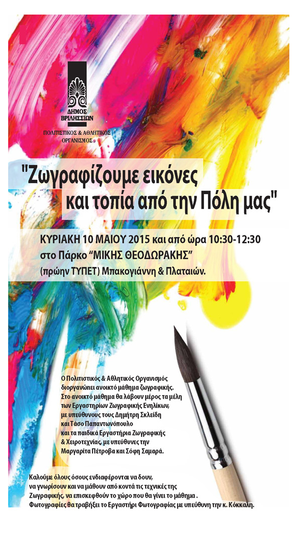 "Ζωγραφίζουμε εικόνες και τοπία από την Πόλη μας" Ο Πολιτιστικός & Αθλητικός Οργανισμός θα διοργανώσει ανοικτό μάθημα ζωγραφικής την Κυριακή 10 Μαίου 2015 και από ώρα 10:30-12:30, στο Πάρκο ΜΙΚΗΣ…