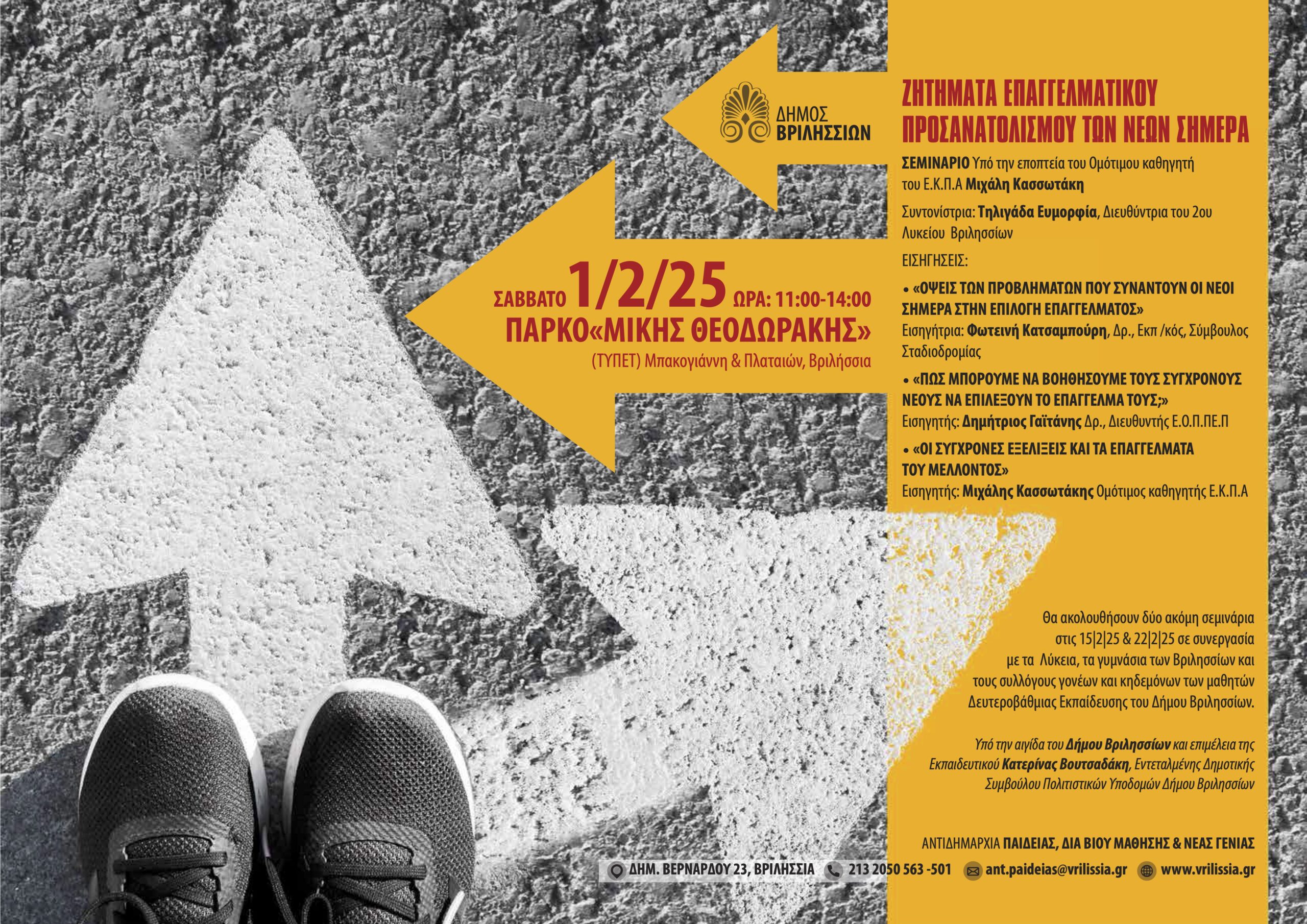 Εστιάζοντας σε θέματα που αφορούν τη νέα γενιά της πόλης μας, σε συνεργασία με τον Ομότιμο καθηγητή του Πανεπιστημίου Αθηνών κ. Μιχάλη Κασσωτάκη ο Δήμος Βριλησσίων διοργανώνει κύκλο σεμιναρίων Επαγγελματικού Προσανατολισμού.…
