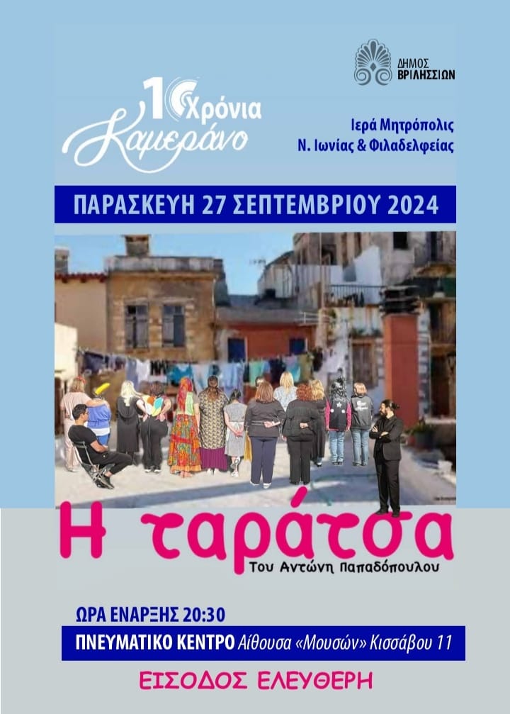 Το θεατρικό εργαστήρι «Καμεράνο» της Ιεράς Μητρόπολης Ν. Ιωνίας και Φιλαδελφείας φιλοξενεί ο Δήμος Βριλησσίων την Παρασκευή 27 Σεπτεμβρίου και ώρα 20:30 στο Πνευματικό Κέντρο στην οδό Κισσάβου 11 με…